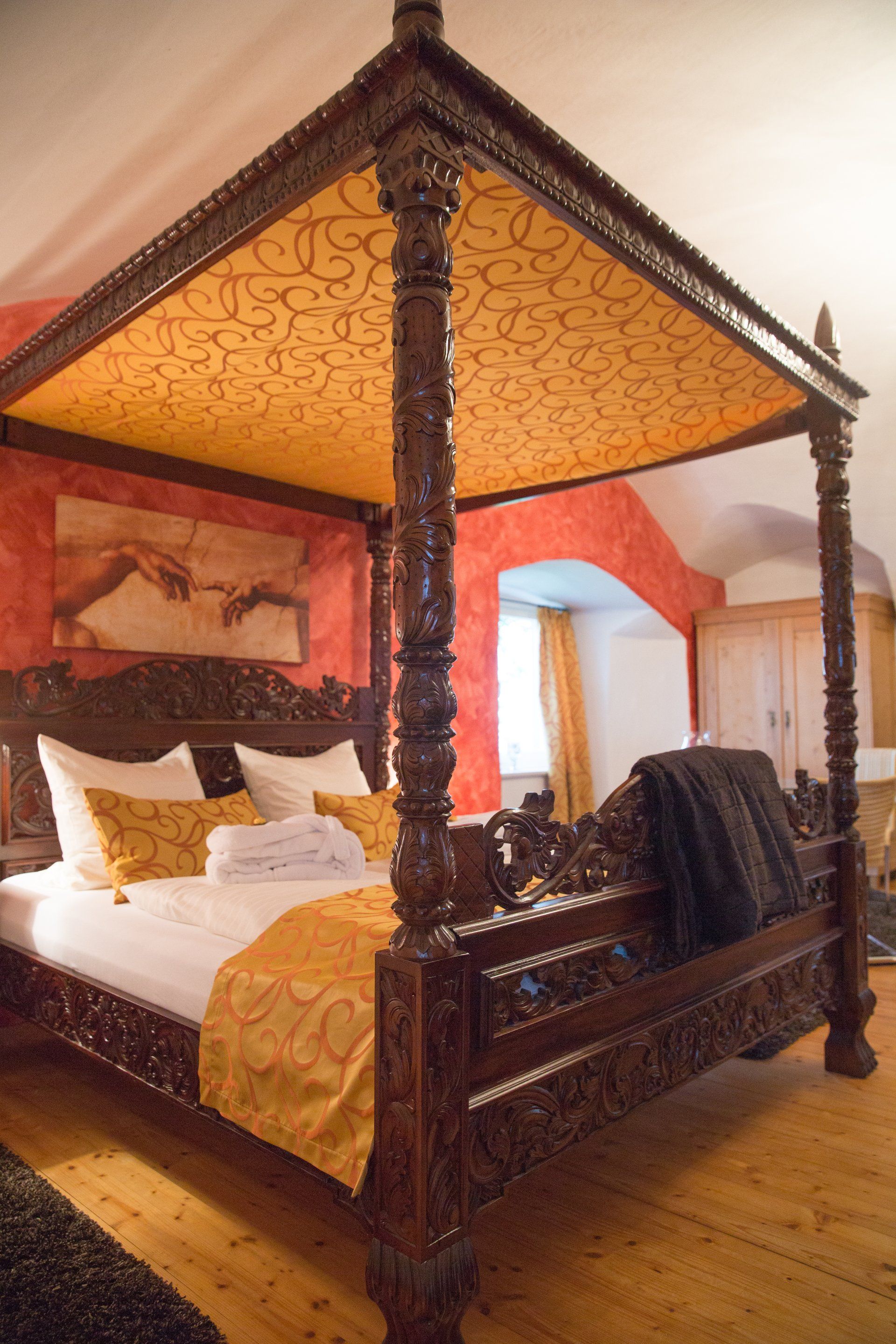 Die Staufersuite ist eine wunderschöne Wohnung mit einem phantastischen Blick über unsere Alpen von den französischen Alpen bis zur Zugspitze. Ein wunderschön geschnitztes Himmelbett, eine tolle Badewanne und schöne Designermöbel erwarten Sie zum Heiratsantrag oder zu einer ganz besonders romantischen Nacht auf der Waldburg in der fürstlichen Staufersuite.