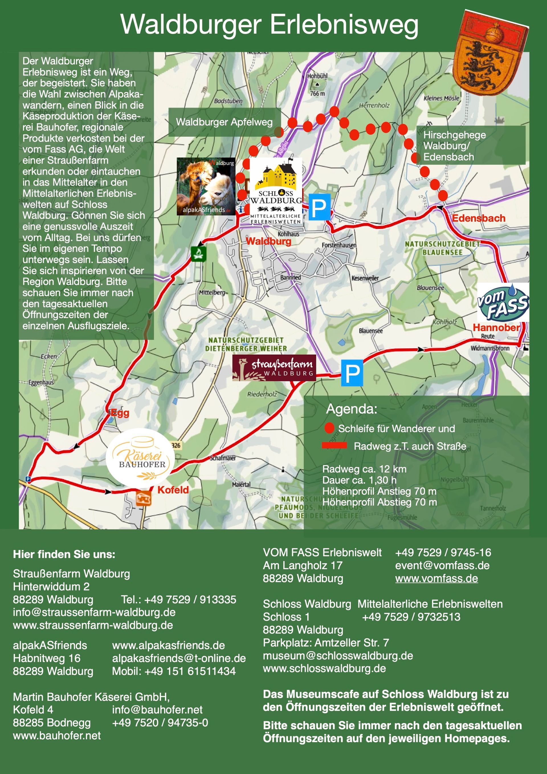 Der Waldburger Erlebnisweg. Sie wollen so richtig etwas sehen und erleben. Dann sind Sie beim Waldburger Erlebnisweg goldrichtig. Straußen in freier Natur, tolle Öle, feiner Essig, Alpakas im Allgäu, leckerer Käse von Allgäuern Kühen. Freuen Sie sich auf einen unterhaltsamen Tag.