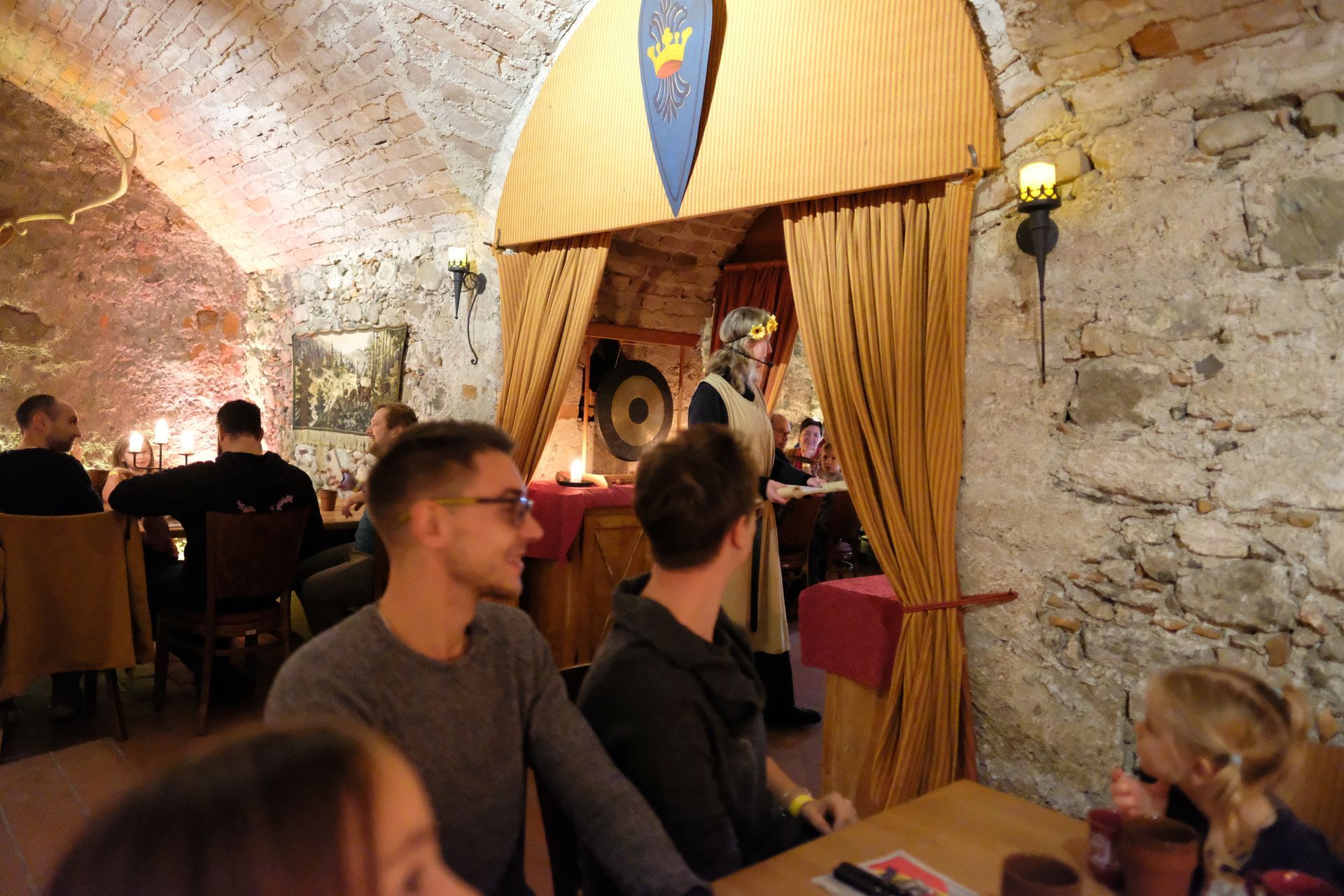 Im Mittelalter ist es üblich, das Sie mit anderen Gästen an den Tischen festen und sich Speis und Trank teilen.
