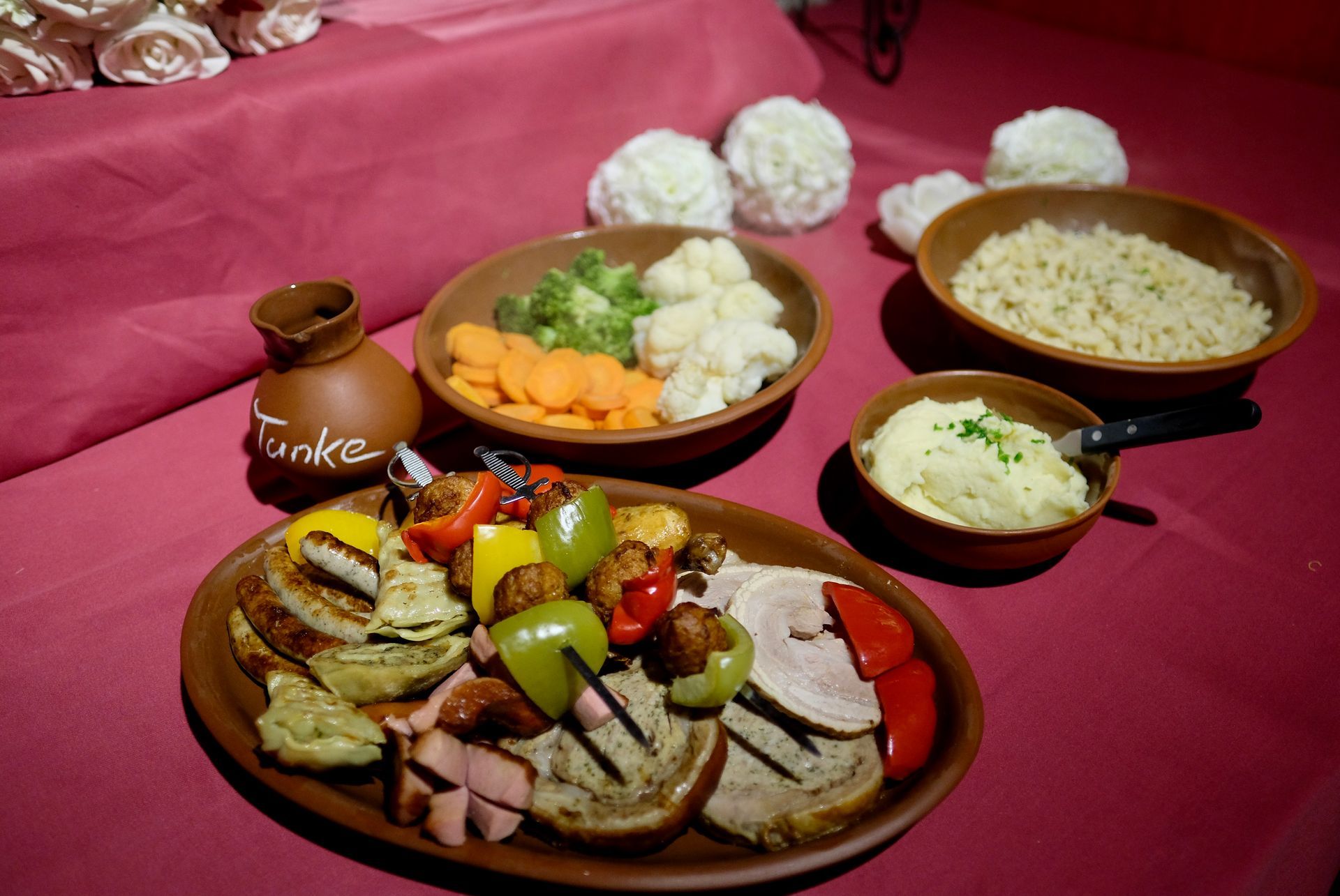 Schweinsbraten, Krakenwürstle, Hähnchenschlegel, Maultaschen klassisch, knackige Kartotten und Saisonales Gemüse,